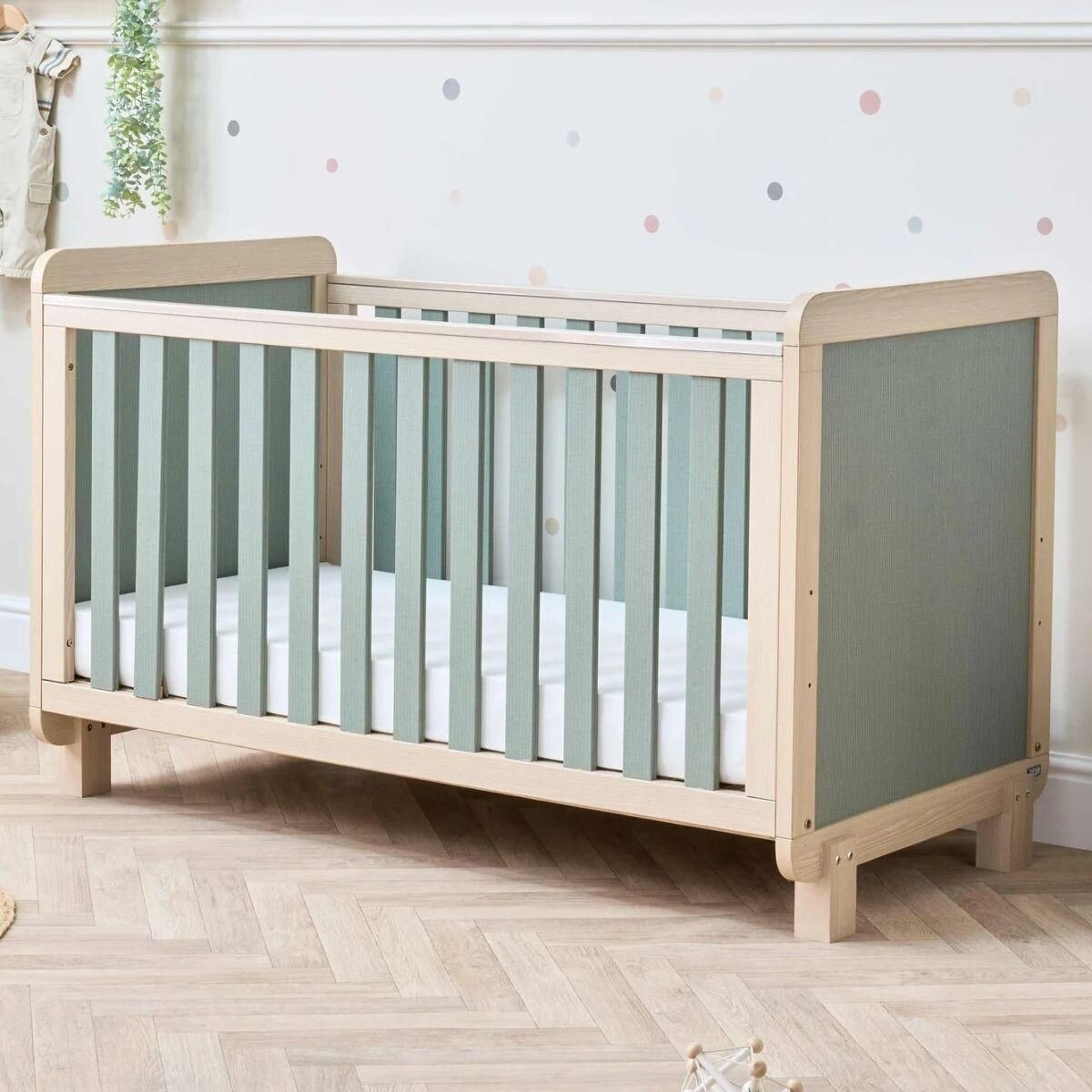 Introducing Kuba - a practical Scandi-style cot bed, with rounded corners, sturdy block legs, and a distinctive sage weave texture on the ends and slats, all beautifully complemented by a pickled oak frame. Designed to grow with your child, it effortlessly transitions from a cosy cot to a junior bed, complete with a matching bed guard for added safety. Thoughtful details like teething rails and three adjustable mattress heights ensure both comfort and convenience. Combining modern craftsmanship and functionality, the Kuba Cot Bed creates a serene and stylish sleep space for your little one to thrive. Suitable from newborn to 4 years.