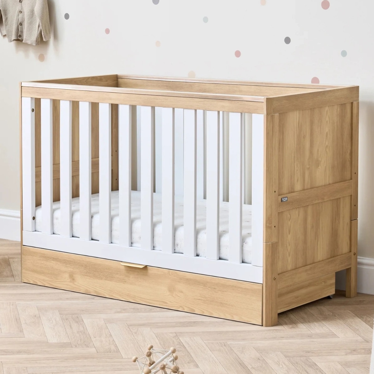 Tutti Bambini Riley Cot with Drawer With Anti Allergy Spring Mattress - Maple Oak-White