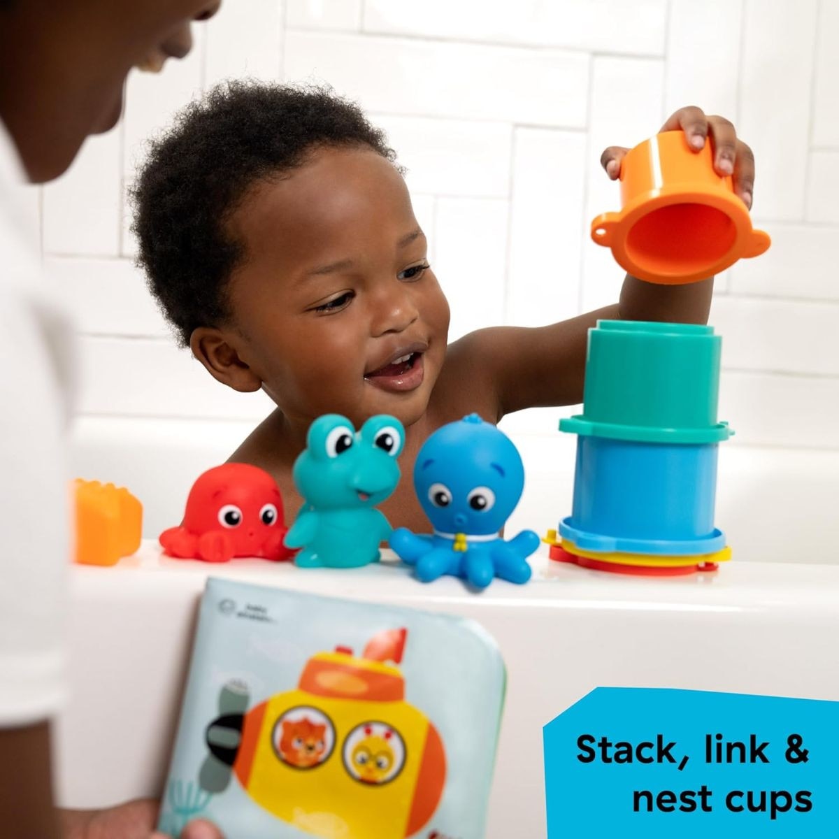 - The Baby Einstein Ocean Explorers Opus Bath Pals 11-piece Bath Gift Set features 5 fillable cups, 5 ocean animals including 1 water squirter, and 1 waterproof book