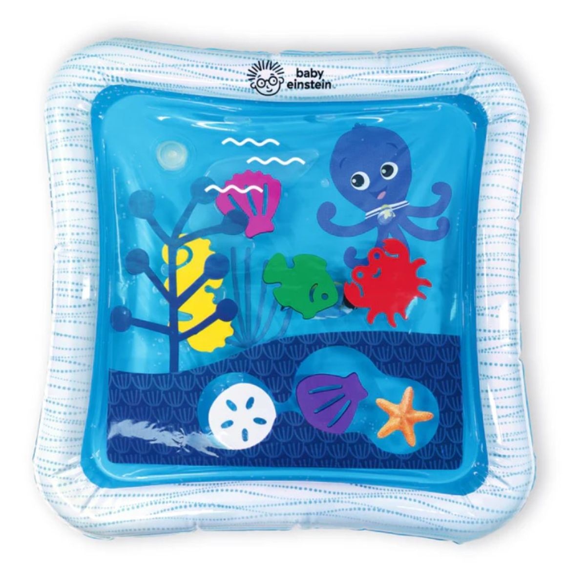 Under the sea exploration is at your baby’s fingertips with Opus’s Ocean of Discovery™ Tummy Time Water Mat, featuring Baby Einstein’s Opus the Octopus. Simply fill the center of the play mat with water and blow up the outer rim with air. During seated play and tummy time, baby can work on muscle development while making the 6 floating sea creatures and shapes move under the surface. Perfect for naturally curious kids ages newborn and up, this hands-on activity introduces cause and effect as they touch the mat and watch the underwater creatures swim. It helps to engage and entertain infants and toddlers while encouraging the development of gross motor skills. Cleanup is easy —just drain the water and air, wipe down the mat, and fold up for storage or travel. Use at home or take along for adventures so your baby can discover the wonder of water and sensory play wherever you go.