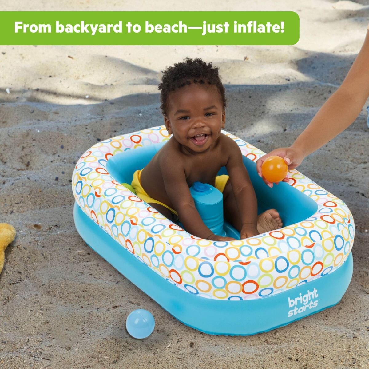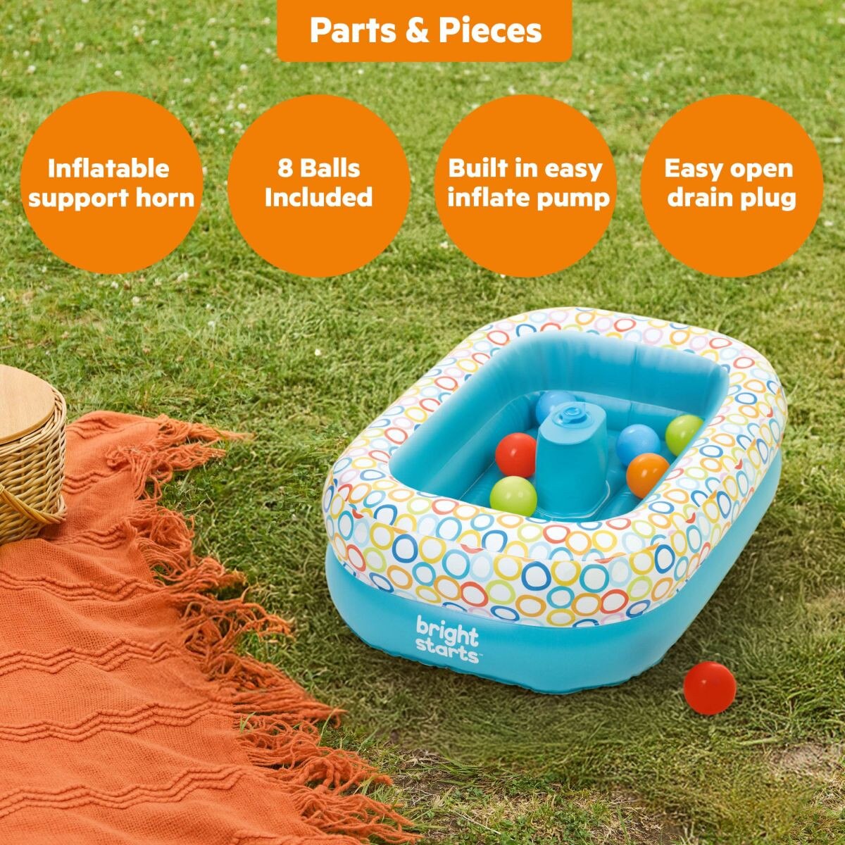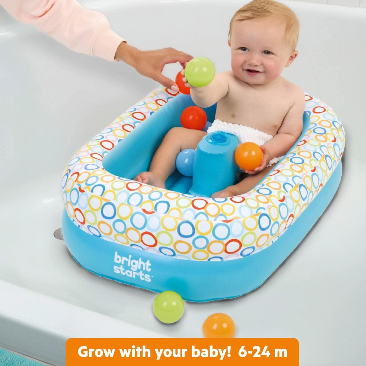 The Bright Starts Bathe & Giggle 2-in-1 Baby Bath Tub and Ball Pit is a versatile solution for babies aged 6–24 months. It inflates in about 2 minutes with the built-in air pump and can be used as a bathtub or a ball pit. The cushioned bottom and center column help keep baby comfortable and stable. Includes 8 floating balls for play. Lightweight, foldable, and quick to air dry, it’s great for home, travel, or outdoor use. Baby must sit up unassisted to use safely.
