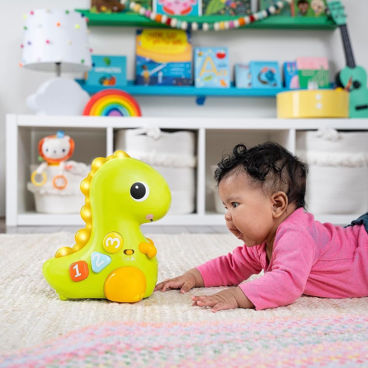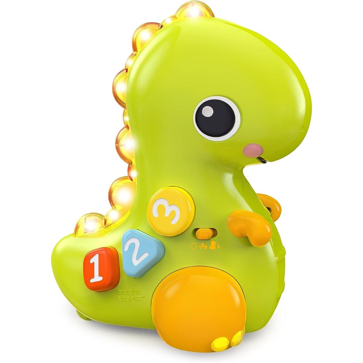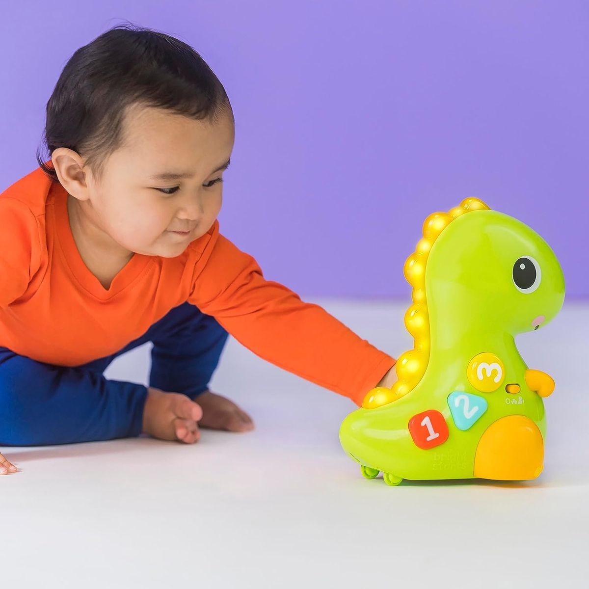 Countdown to a crawling Chase in 3, 2, 1.. Go! The go, go Dino Musical light-up dinosaur toy from Bright Starts rolls around to encourage baby to get movin'. When you've caught up to this dinosaur toy, discover numbers, colors and shapes with easy to push buttons. Just a tap of the nose will activate music, lights, motion and silly sounds. Get ready to T-Rex & roll!