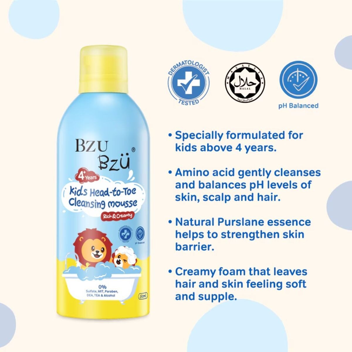 Introduce your little ones to gentle care with BZU BZU Kids Head-To-Toe Cleansing Mousse. This rich and creamy 350ml formula is specially designed for children over 4, ensuring a safe, sulfate-free cleansing experience. Enriched with natural purslane essence, it strengthens the skin barrier while amino acids gently cleanse and balance pH levels for skin, scalp, and hair. Dermatologist-tested and free from harmful chemicals like parabens and alcohol, this mousse creates a delightful creamy foam, leaving hair and skin feeling soft, supple, and nourished. Perfect for bath time fun!
