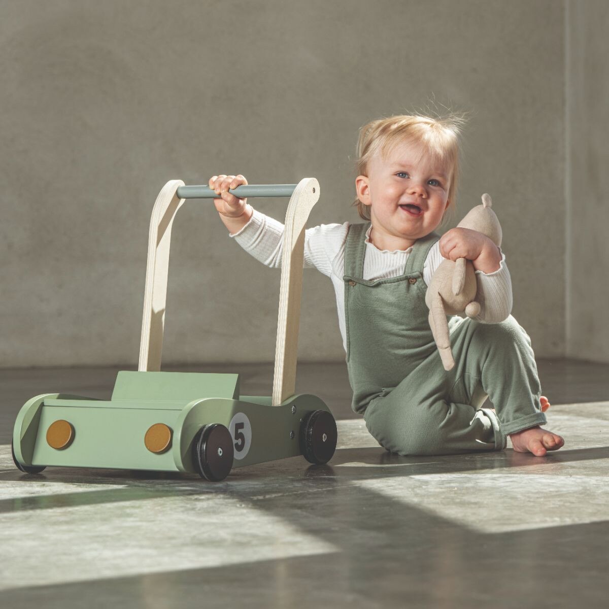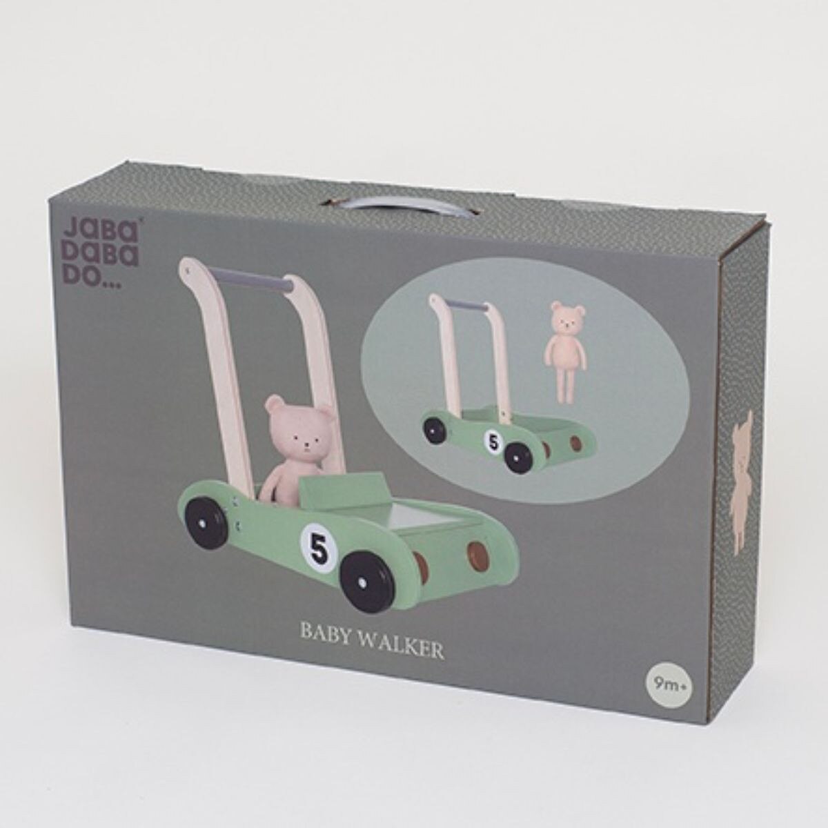 Jabadabado's baby walker in wood is the perfect companion when you take your first steps. The walker is designed like a small car and the popular character Teddy sits ready to follow you on every adventure. The walker provides stable and safe support even for small children who have just started walking as it has adjustable brakes on the rear wheels. There is also a smart built-in storage as the lid can be removed and underneath it you find the perfect hiding place for all your favourite toys. The soft pastel colour makes the walker a nice detail in the children's room. The wheels have a rubber ring, so they roll safely on all surfaces without leaving marks. The baby walker will be an appreciated gift that can be played with for a long time, and it is perfect as a baptism gift or for the first birthday.