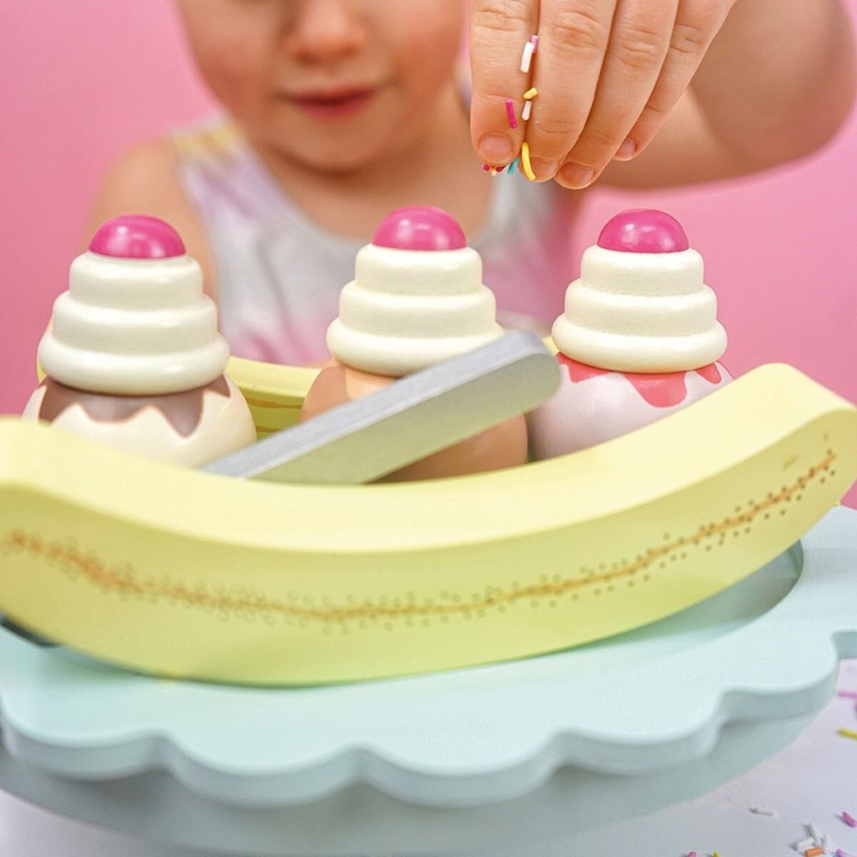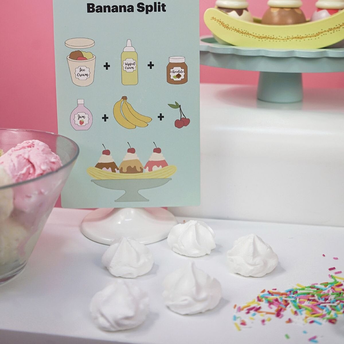 - Our banana split includes: 1 platter, 1 spoon, 2 bananas, 3 scoops of ice cream in different flavors, 3 cream toppings with cherries, 1 recipe card.