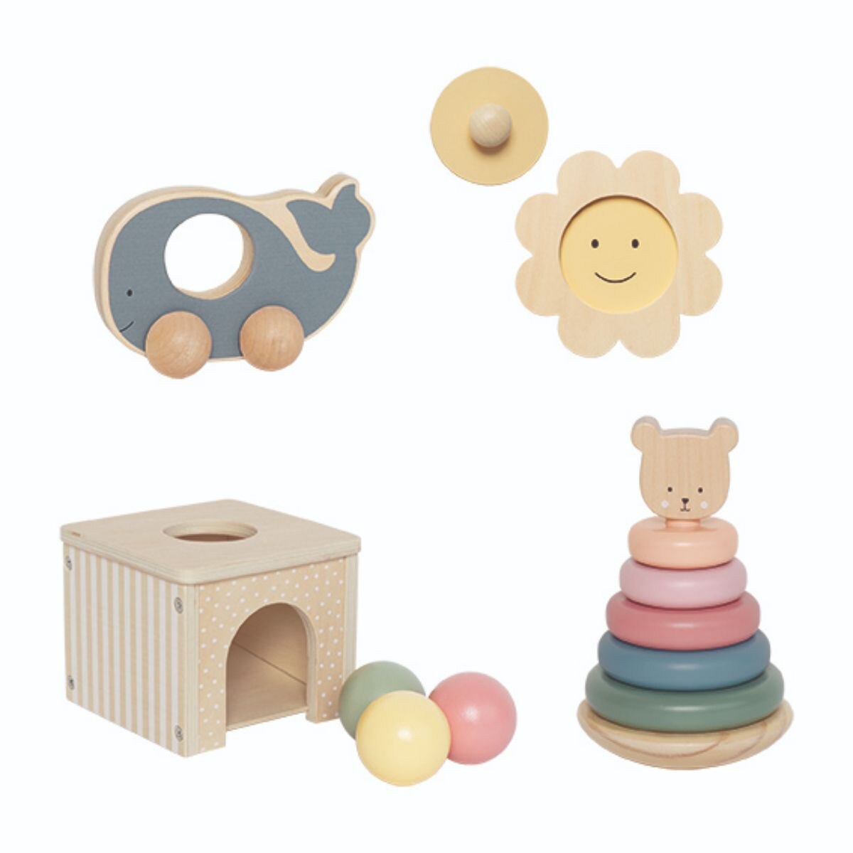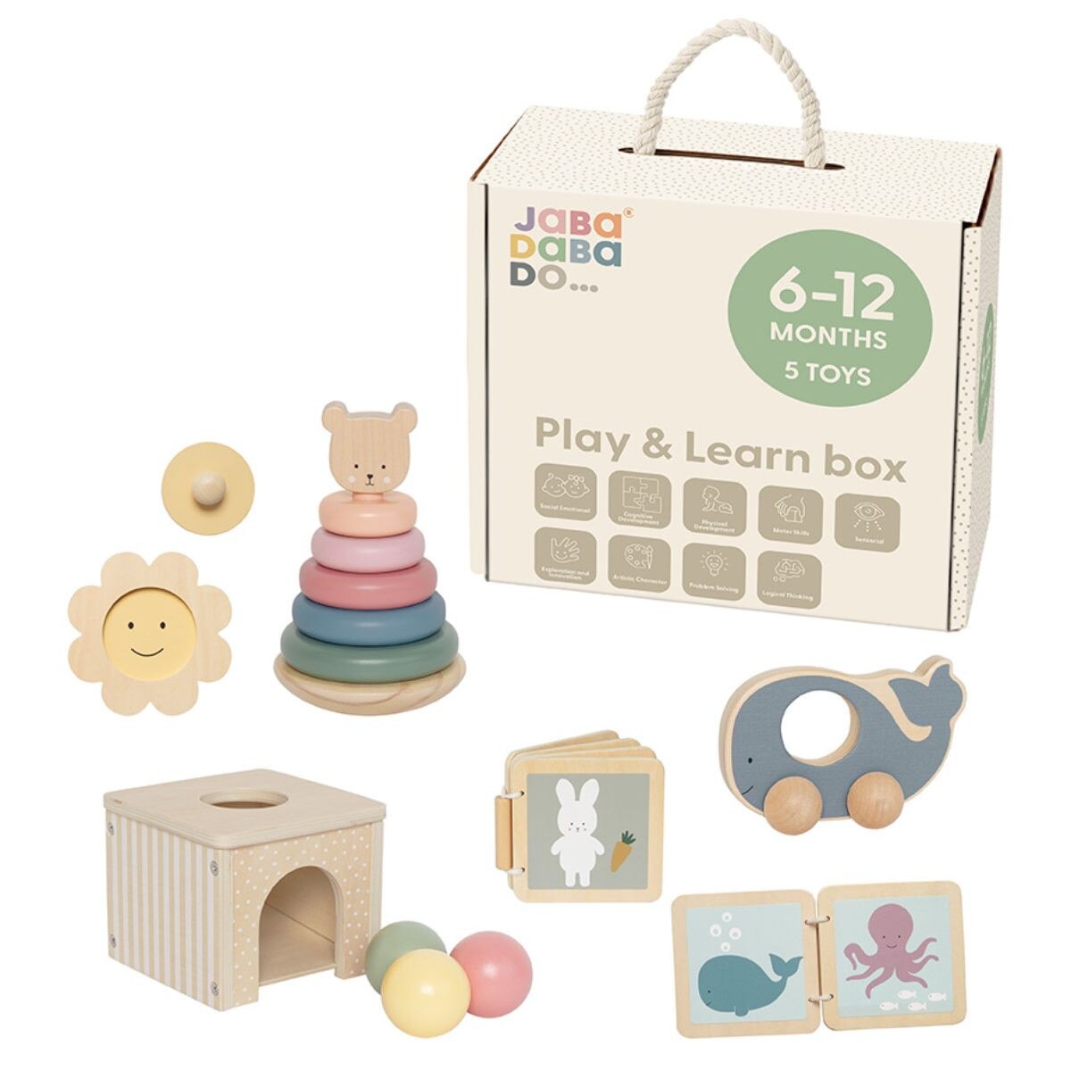 This play and learn box from Jabadabado contains five carefully selected toys designed to offer baby an exciting journey through play and development. Each toy has a clear purpose to enable a baby aged 6-12 months to develop their motor skills and stimulate their cognitive abilities. Pull whale. This whale can function both as a pull animal and as a small car. The toy has an adorable whale shape and a handle designed for easy gripping by little hands. Through this entertaining toy, babies can practice their hand movements and motor skills.Wooden book animals. Baby's first small wooden book with eight pages decorated with animal motifs. The book is easy for baby to hold, and each page is easy for little hands to turn.First puzzle. Discover the fun of our first puzzle for toddlers! Perfectly adapted for little hands, this puzzle strengthens coordination, fine motor and problem-solving skills, and provides an entertaining start to your child's puzzling adventures. Play and learn in one!Play drop box. This box promotes babies' development of hand-eye coordination and stimulates fine motor skills, while awakening curiosity from an early age. Through observation, baby's concentration is strengthened, and by watching the ball disappear into the box and then roll out, baby begins to understand the permanence of things.Stacking Teddy. Stacking Teddy contains five colorful round stacking rings and a bear-shaped top. This toy promotes fine motor skills, concentration, attention span, hand-eye coordination, spatial awareness and problem-solving.