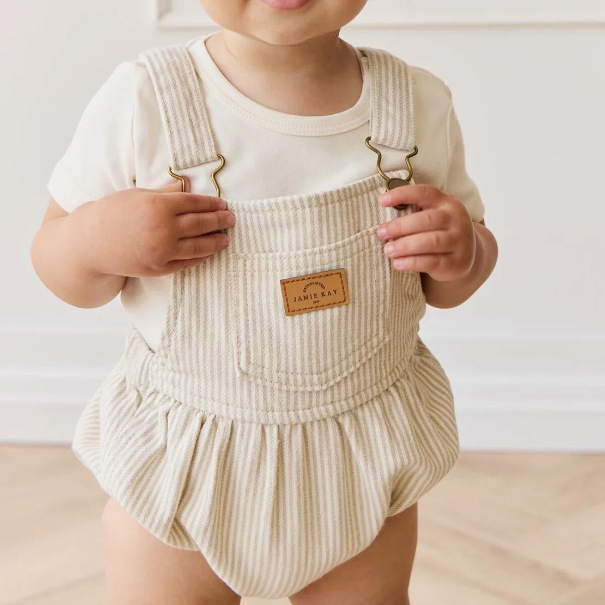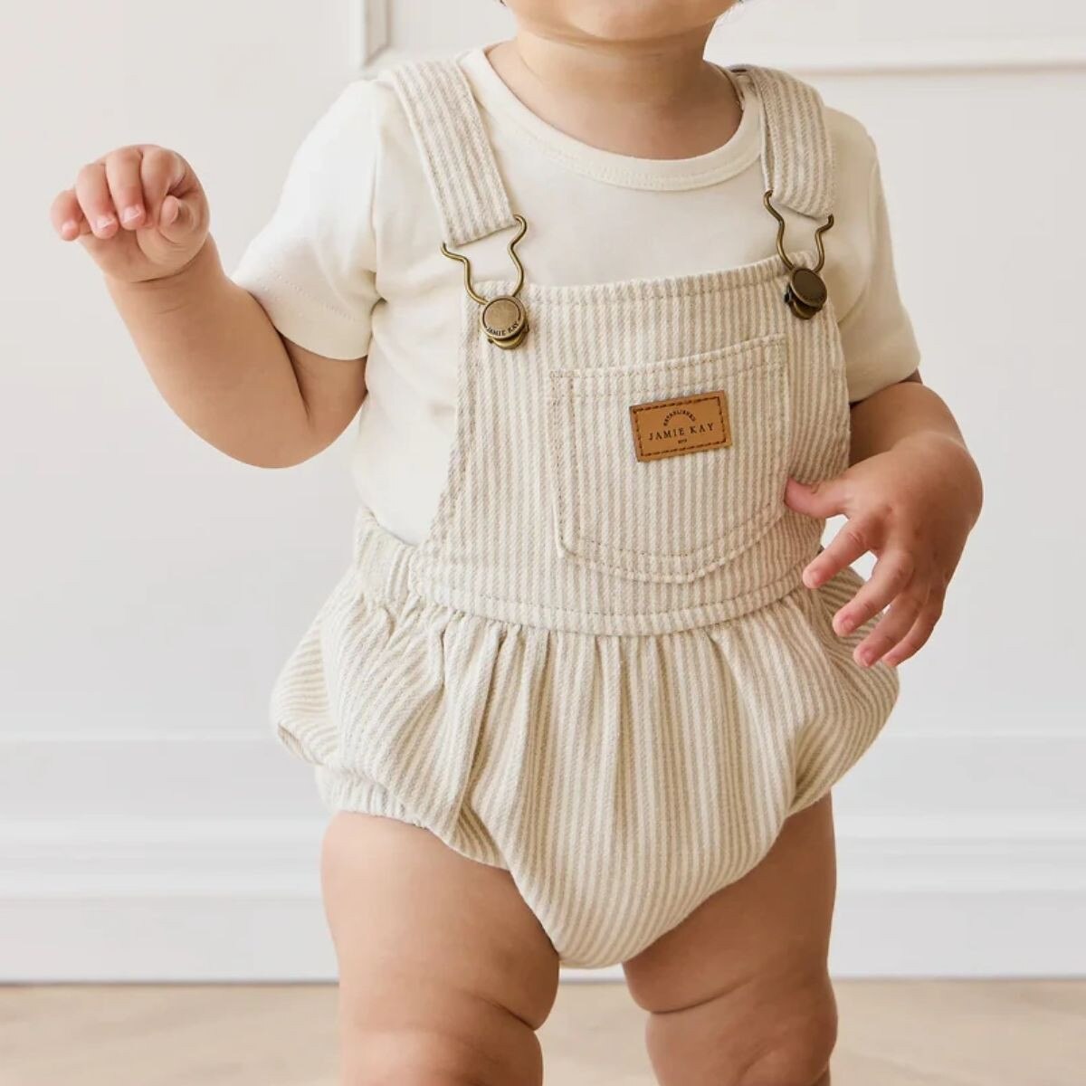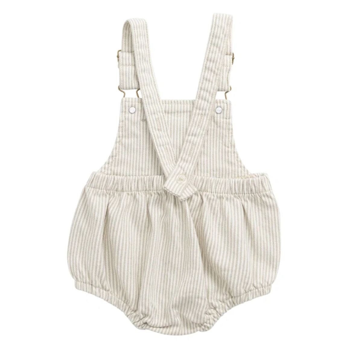 The Pax Playsuit – Fine Vertical Stripe Sandy Brown/Cloud is a timeless piece designed for comfort and style. Featuring soft vertical stripes in sandy brown and cloud tones, this playsuit includes adjustable suspender-style straps with metal buckles, an elasticated waist and leg openings, and a sweet chest patch detail for added charm.Made from 98% cotton and 2% elastane, the fabric is breathable and soft with a gentle stretch—perfect for active little ones. The vintage-inspired stripe pattern adds a touch of elegance to everyday wear, while the elasticated fit ensures ease of movement and all-day comfort.