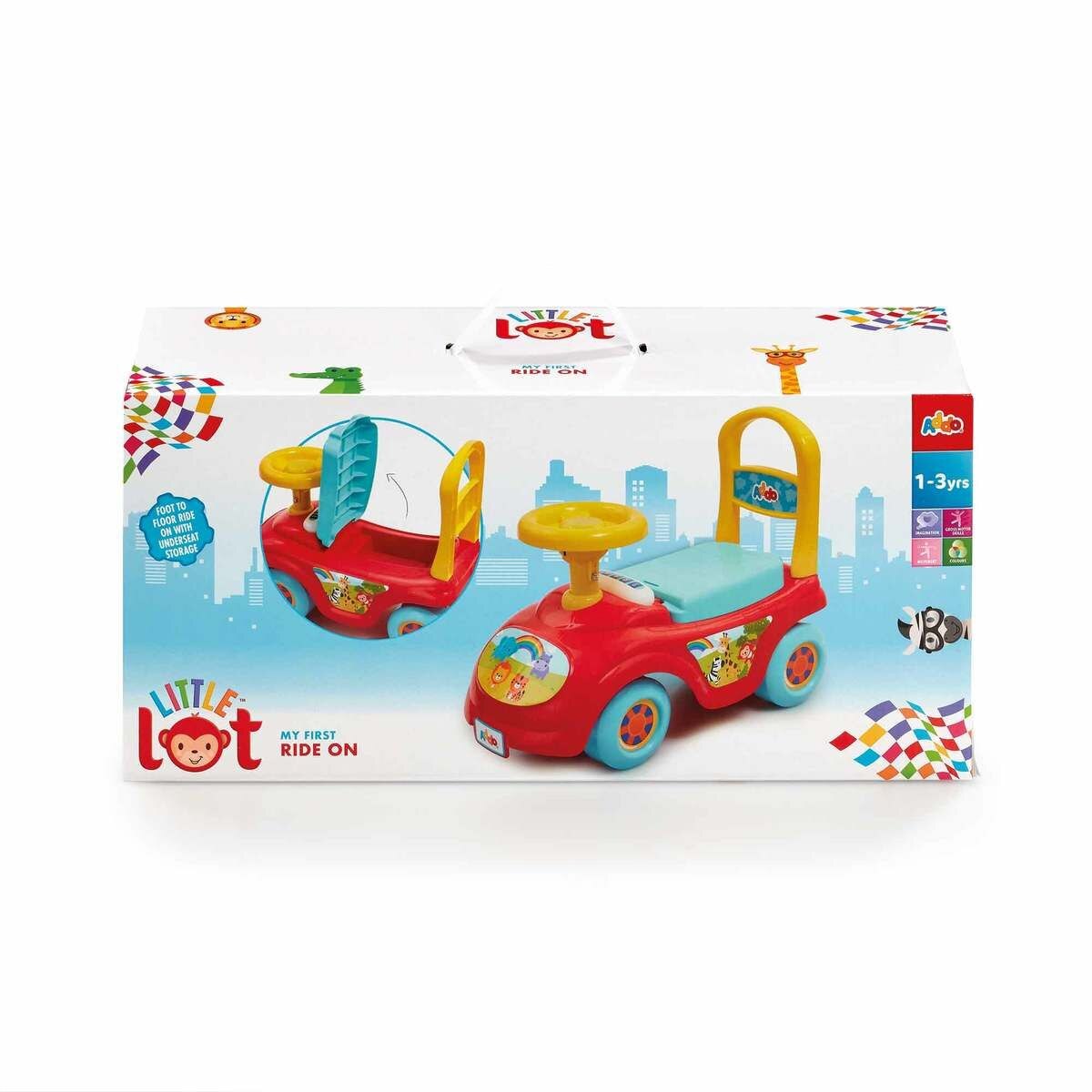 Beep beep! It's time for an adventure. Children will love riding through the garden or around the house on their very own Ride On. Grown-ups can push them along using the sturdy handle, or children can try moving themselves using their feet. They can move the steering wheel and beep the horn too! This Ride-On vehicle comes in a bright red and blue design, with friendly animal stickers as decoration