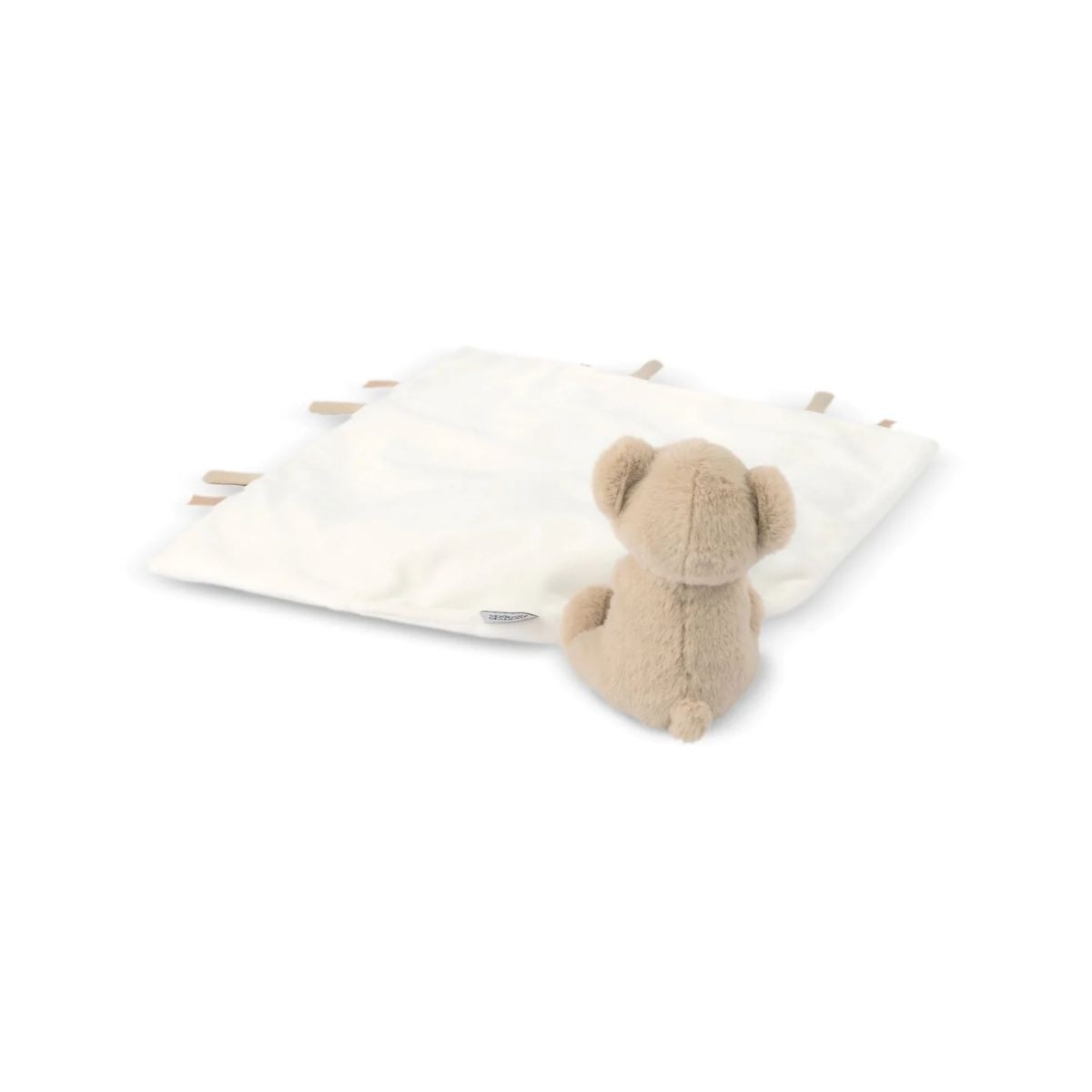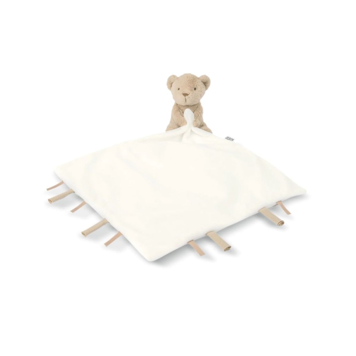 Our teddy bear comforter will be by their side from day one. Crafted from super-soft faux fur, this little bear is holding onto a soft comfort blanket, with jersey cotton and ribbon detailing around the edge.