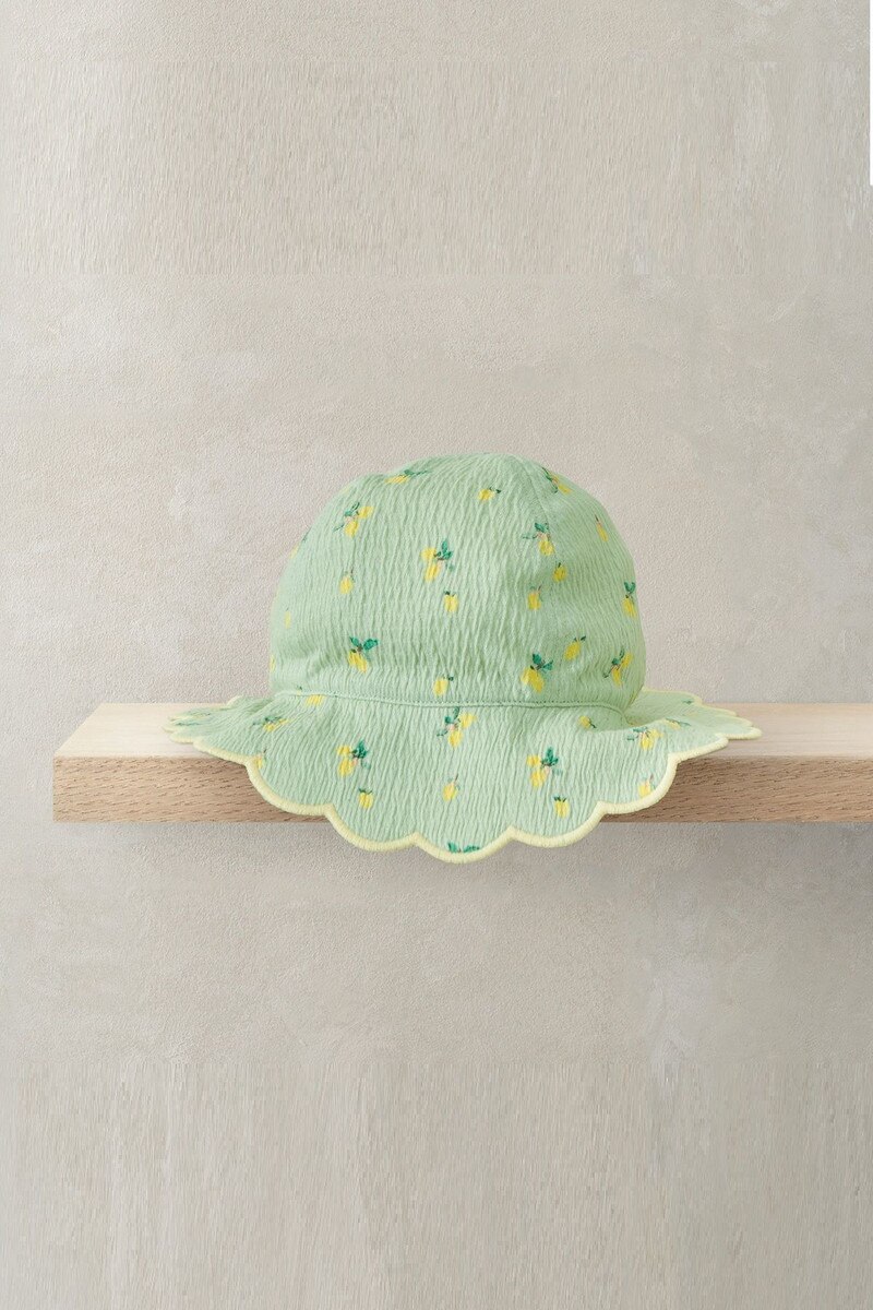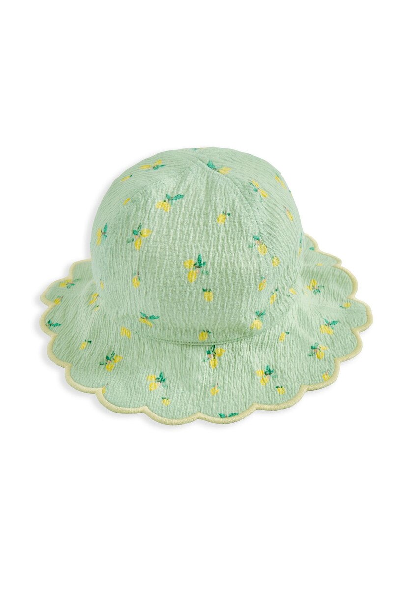 Perfect for sunny days, this girls’ reversible hat is both practical and cute. Made from soft crinkle jersey, it features a mint green side with an all-over lemon print and a plain pink reverse, finished with a pretty scalloped edge for an extra sweet touch.