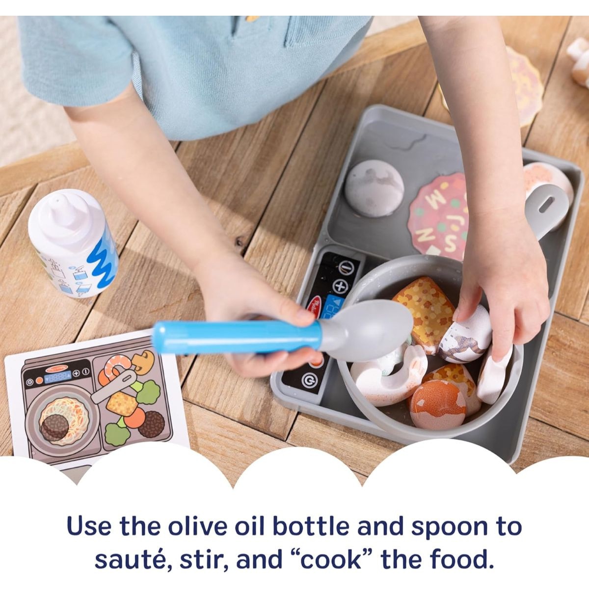 - stovetop, spoon, squeeze bottle; color-changing items: 6 vegetables, 6 proteins, 2 double-sided meal disks; play cooking pot, double-sided activity card