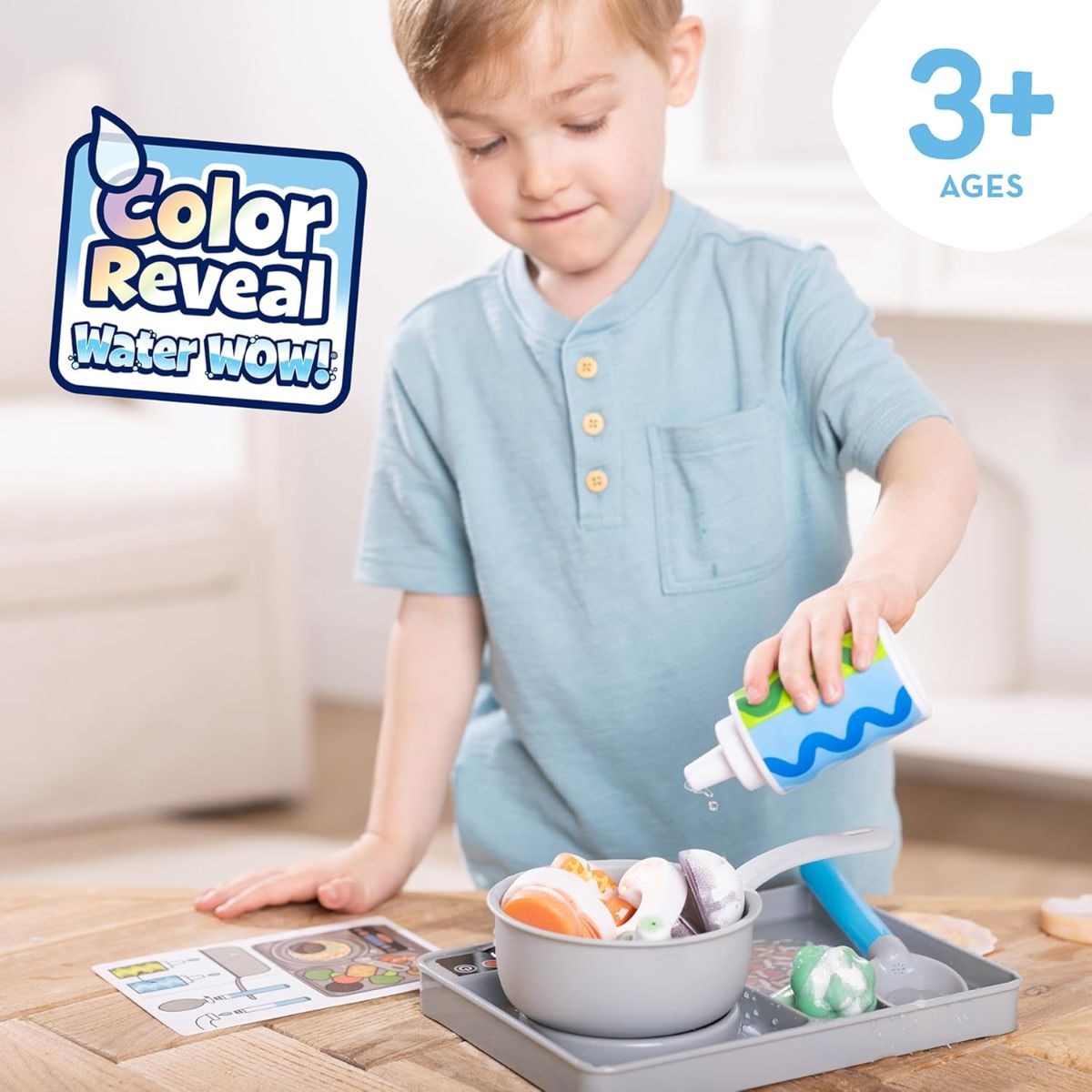 - Includes durable stovetop, water-dispensing spoon and squeeze bottle, cooking pot, 6 color-changing vegetables, 6 color-changing proteins, 2 color-changing meal disks, and double-sided reusable activity card