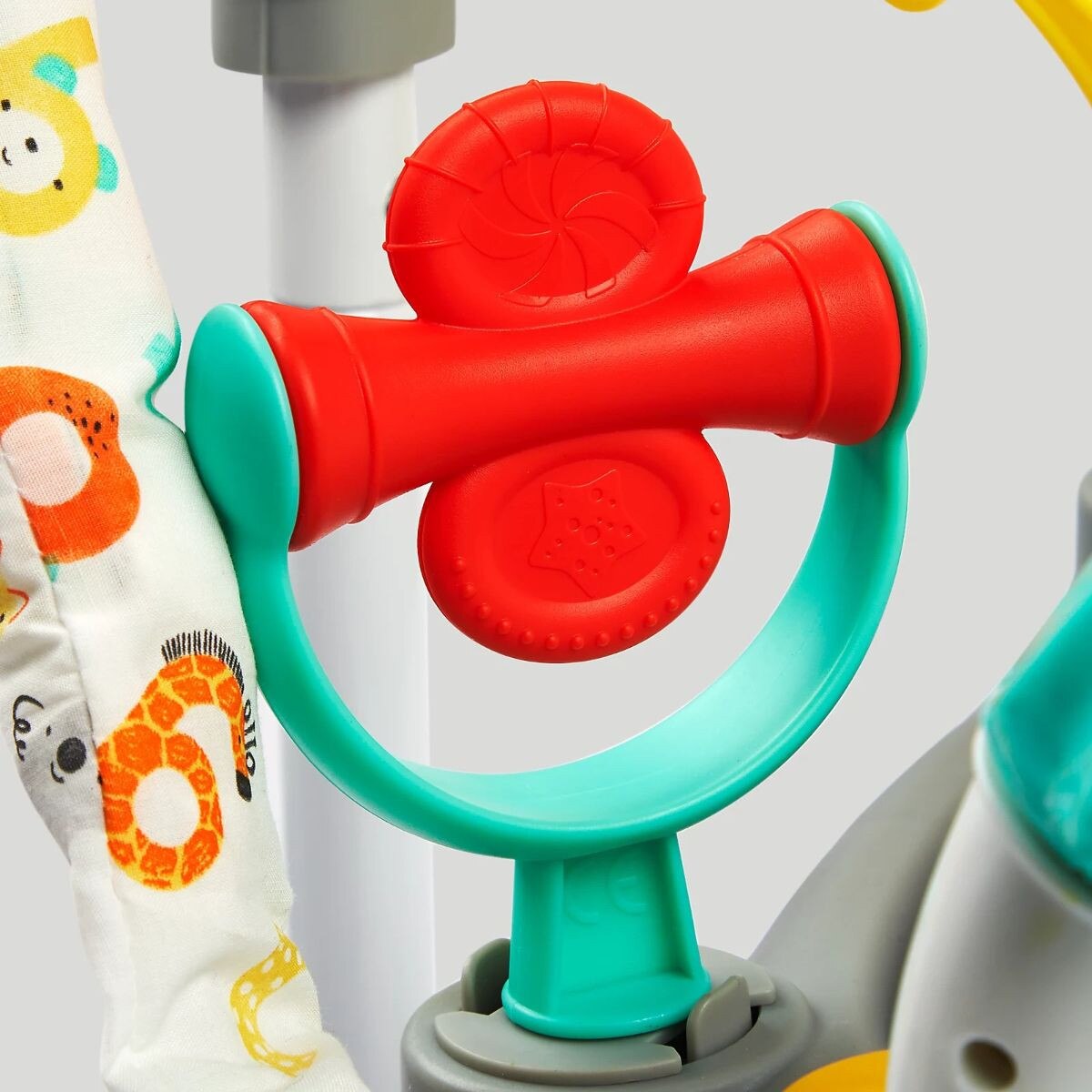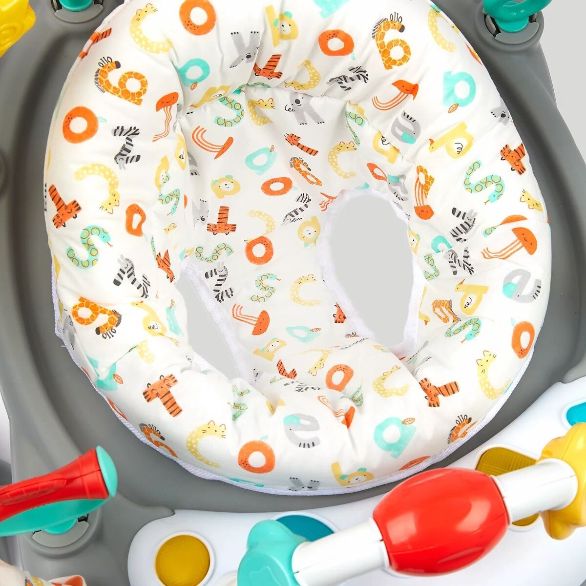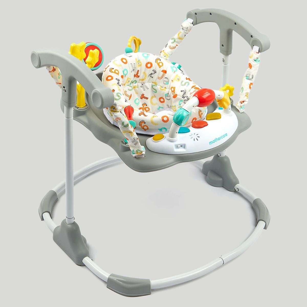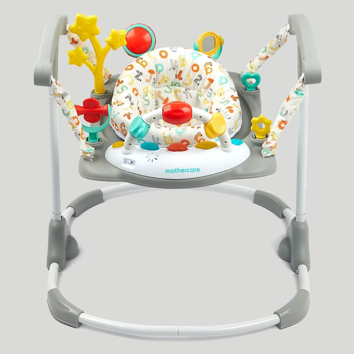 Get ready to jump and play with our bright, fun activity jumper. This jumper toy is so much fun for babies with lots of sensory and developmental toys to engage and entertain. As baby bounces around, they can play with the toys, clickers, rattles, spinners, mirror and much, much more. They can even discover lights and sound effects on the removable electronic toy tray.With a sturdy frame and comfy seat unit, baby can safely bounce and play as they develop gross and fine motor skills. The seat rotates 360 degrees too, which means there is always something new to discover and enjoy.