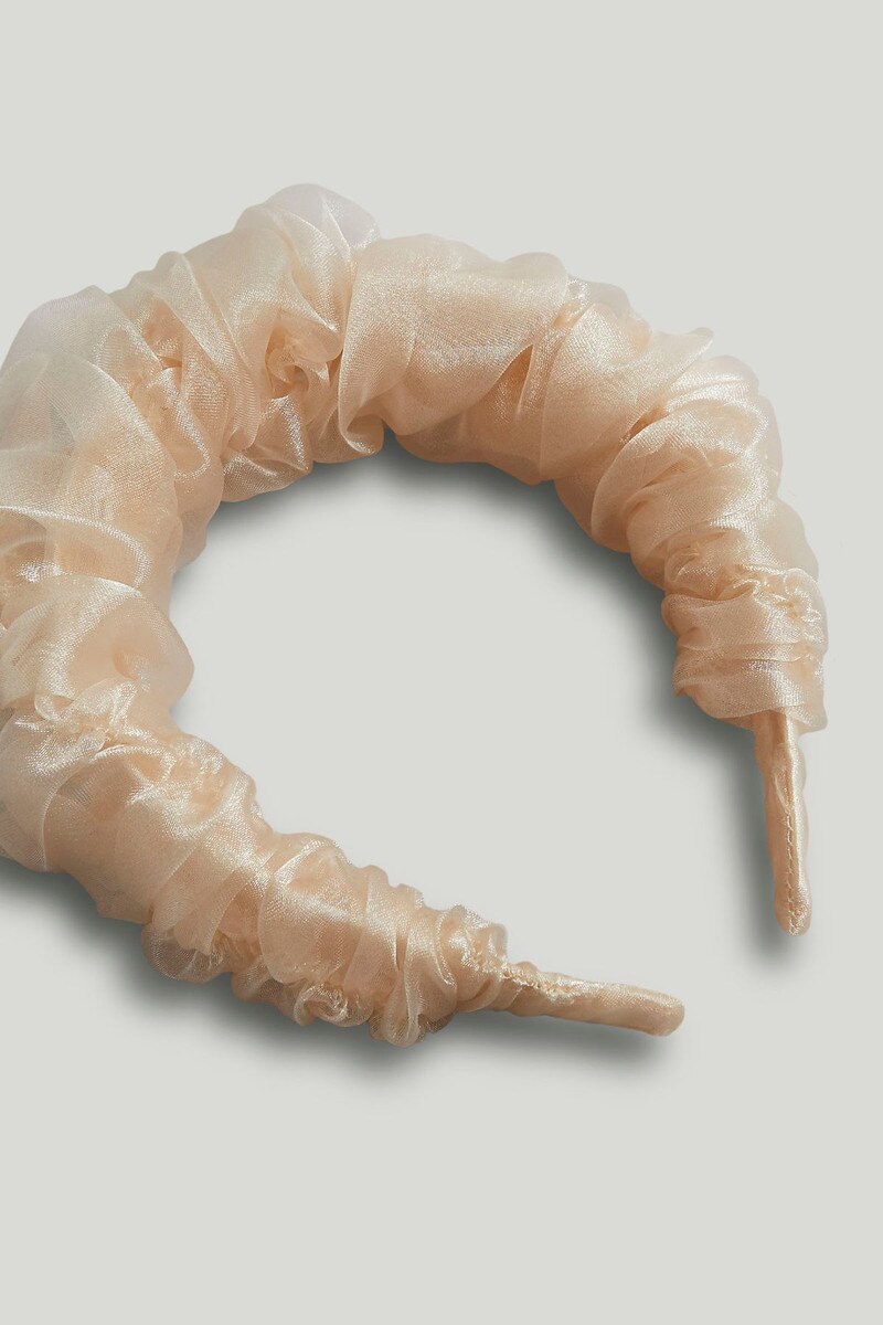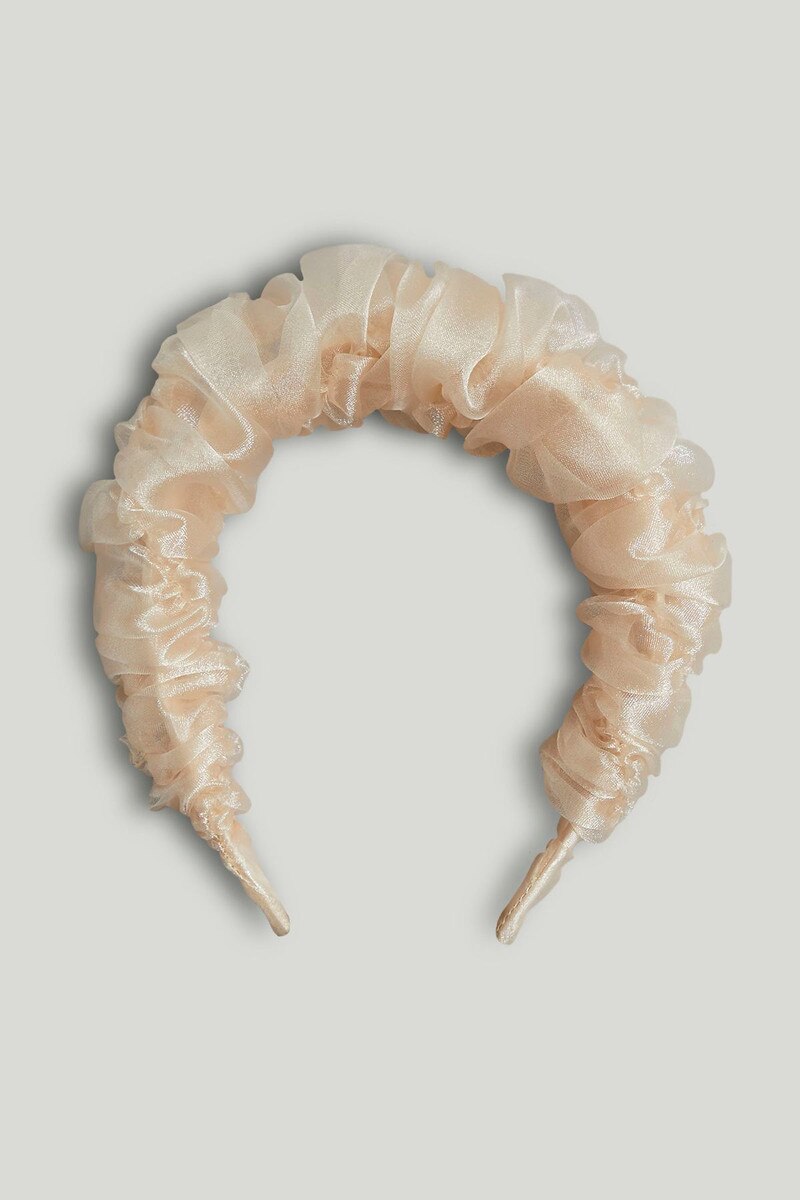 A pink ruffle headband, perfect for special occasions.