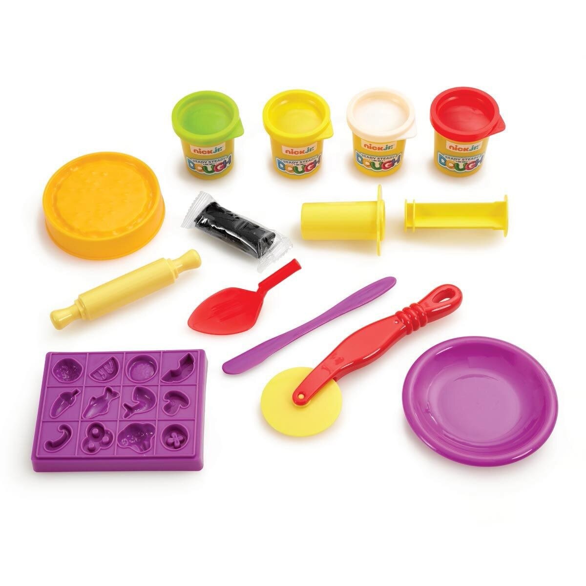 Ready! Steady! Dough! It's time to get creative and rustle up an Italian feast or whip up a deep pan with the Pizza Playset from Nick Jr. Ready Steady Dough.Serve up yummy looking Italian treats to friends and family- a slice of pizza or a plate of pasta with all of the toppings. Will your base be thin crust or deep pan? Use the rolling pin to make the perfect base. What toppings will you add to your pizza- mushrooms, olives or pepperoni? The squeezy piping tool will help you create piles of spaghetti, or use the moulds and cutters to add shrimp, meatballs or chillies to your culinary masterpiece.Use the colour chart on the back of the pack to help you blend any colours you need to complete your fun masterpieces. Endless creation- hours of sensory fun with Nick Jr. Ready Steady Dough.