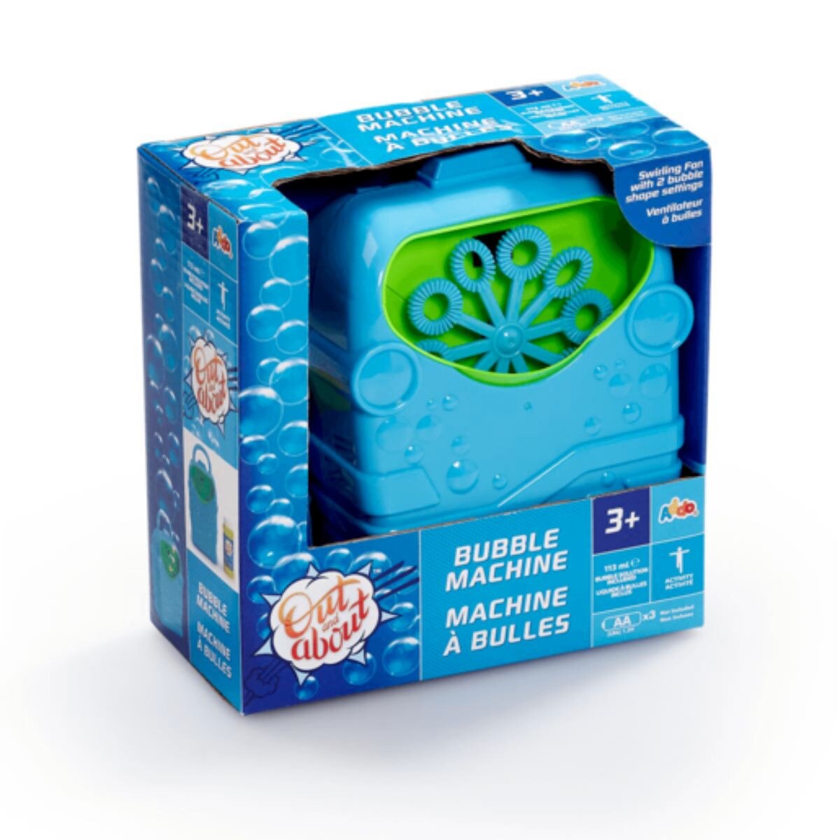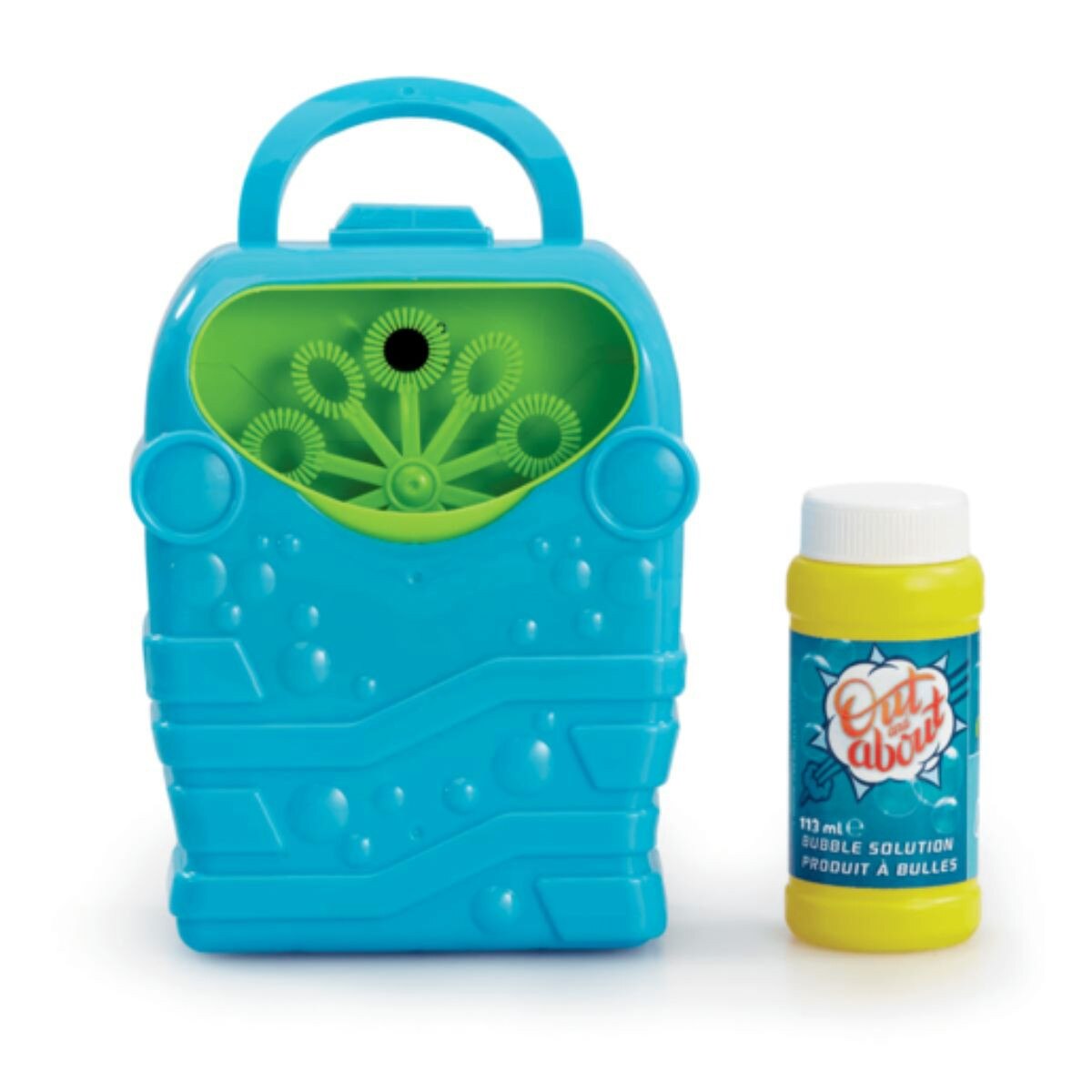 - The cool, bright blue design of the Out and About Bubble Machine includes an easy to grab handle so that you can take the bubble fun with you anywhere and everywhere.