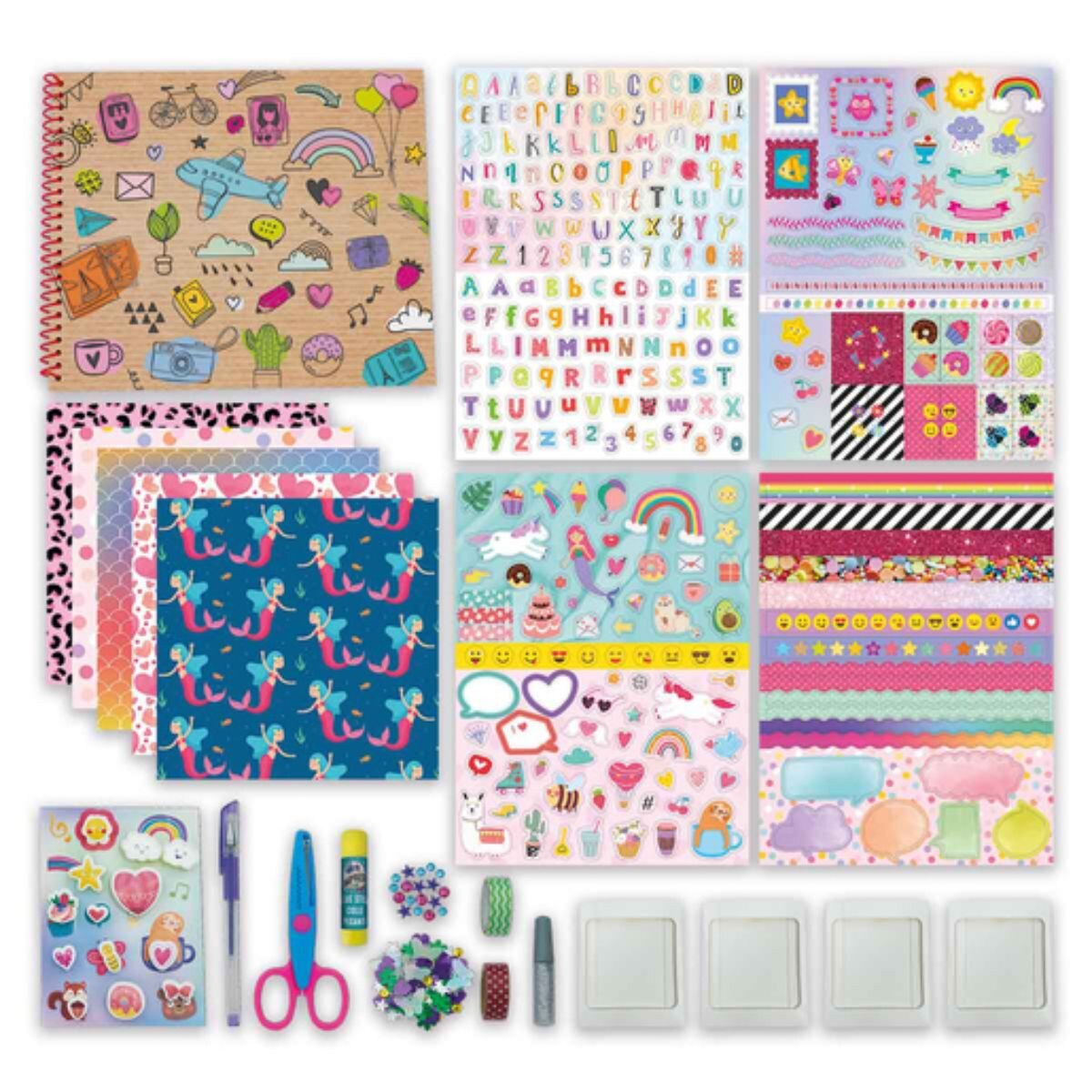 - Includes 20-page hardback, spiral bound scrapbook and over 300 fun scrapbooking accessories including sequins, stickers, glue, scissors, tape, glitter glue, paper, pen