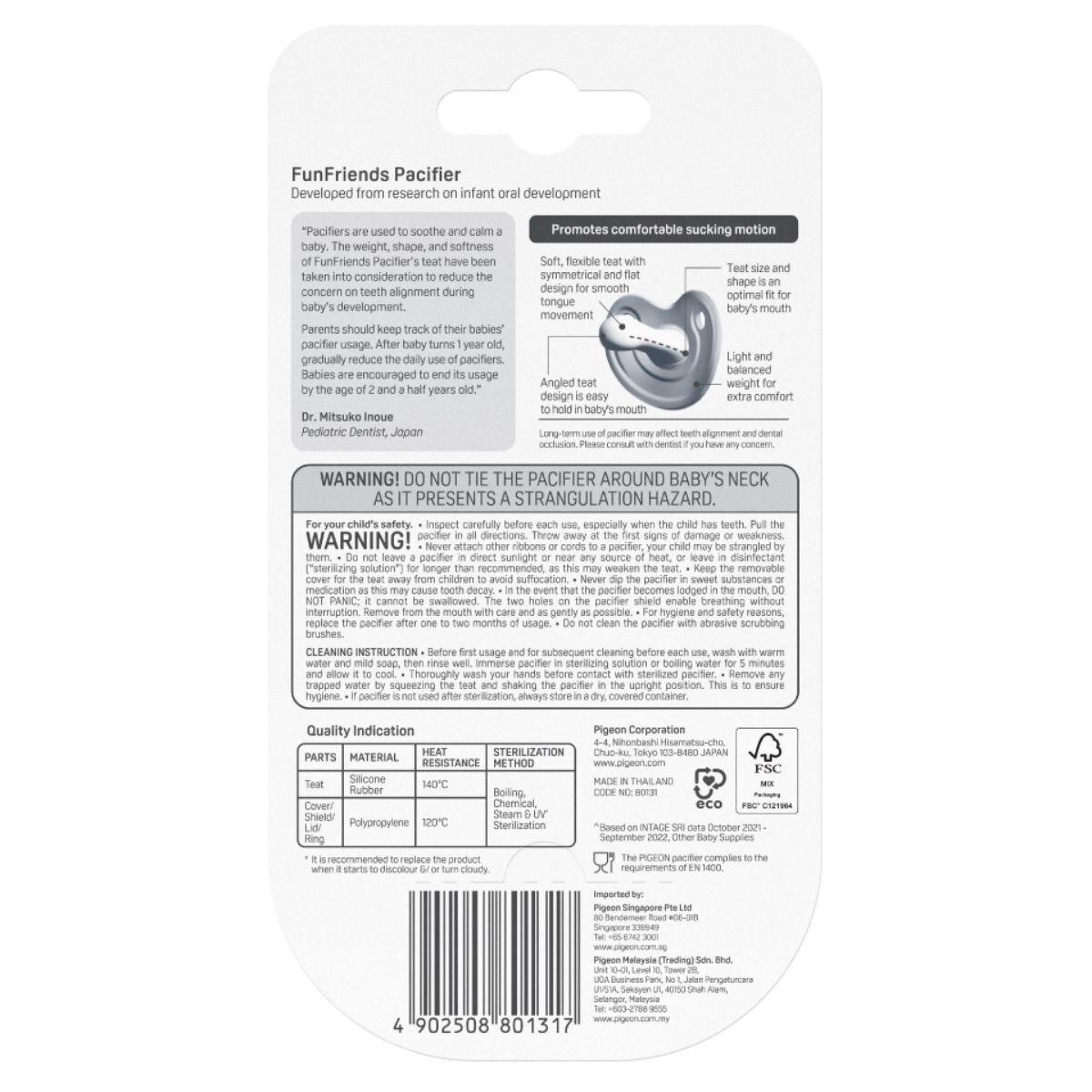 Pigeon FunFriends Pacifier is specially developed with the support from Japan Pediatric Dentist to reduce the concern on teeth alignment. The unique design of our pacifier promotes baby’s comfortable sucking motion and has a balanced weight so that it is less likely to fall off from baby’s mouth. Its soft, flexible teat is symmetrical and flat to allow optimum room for tongue movement. Available in adorable designs to soothe and calm your little one in style!