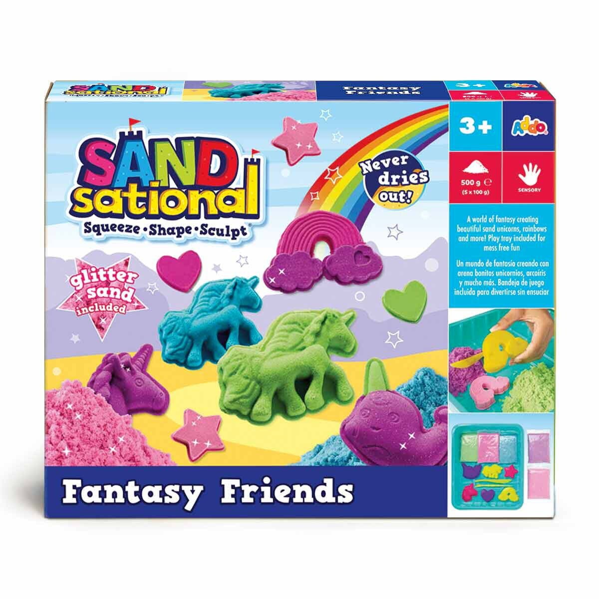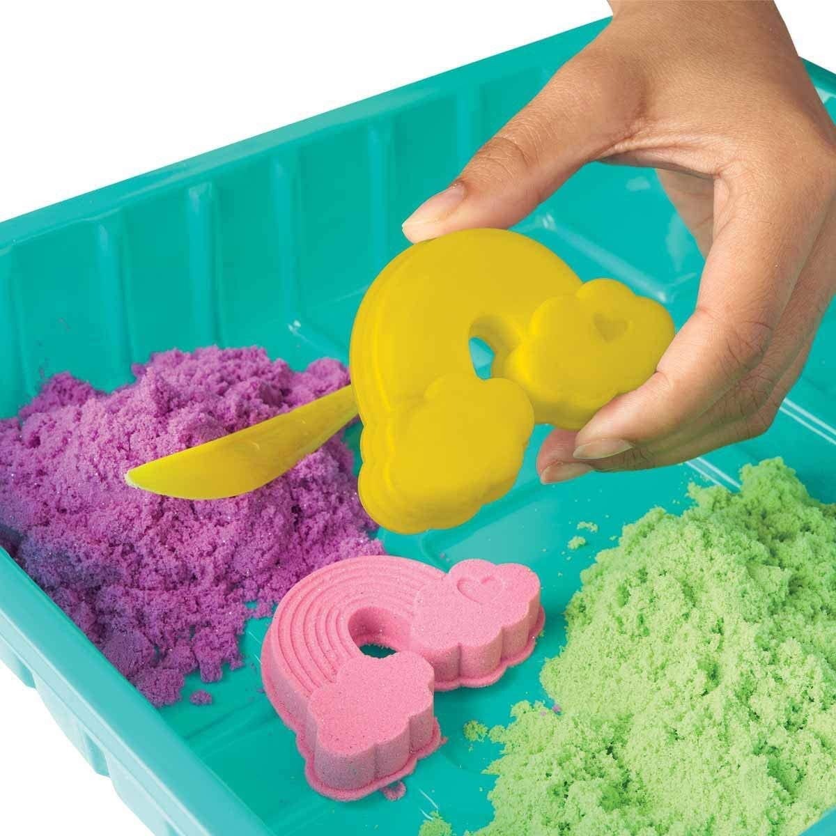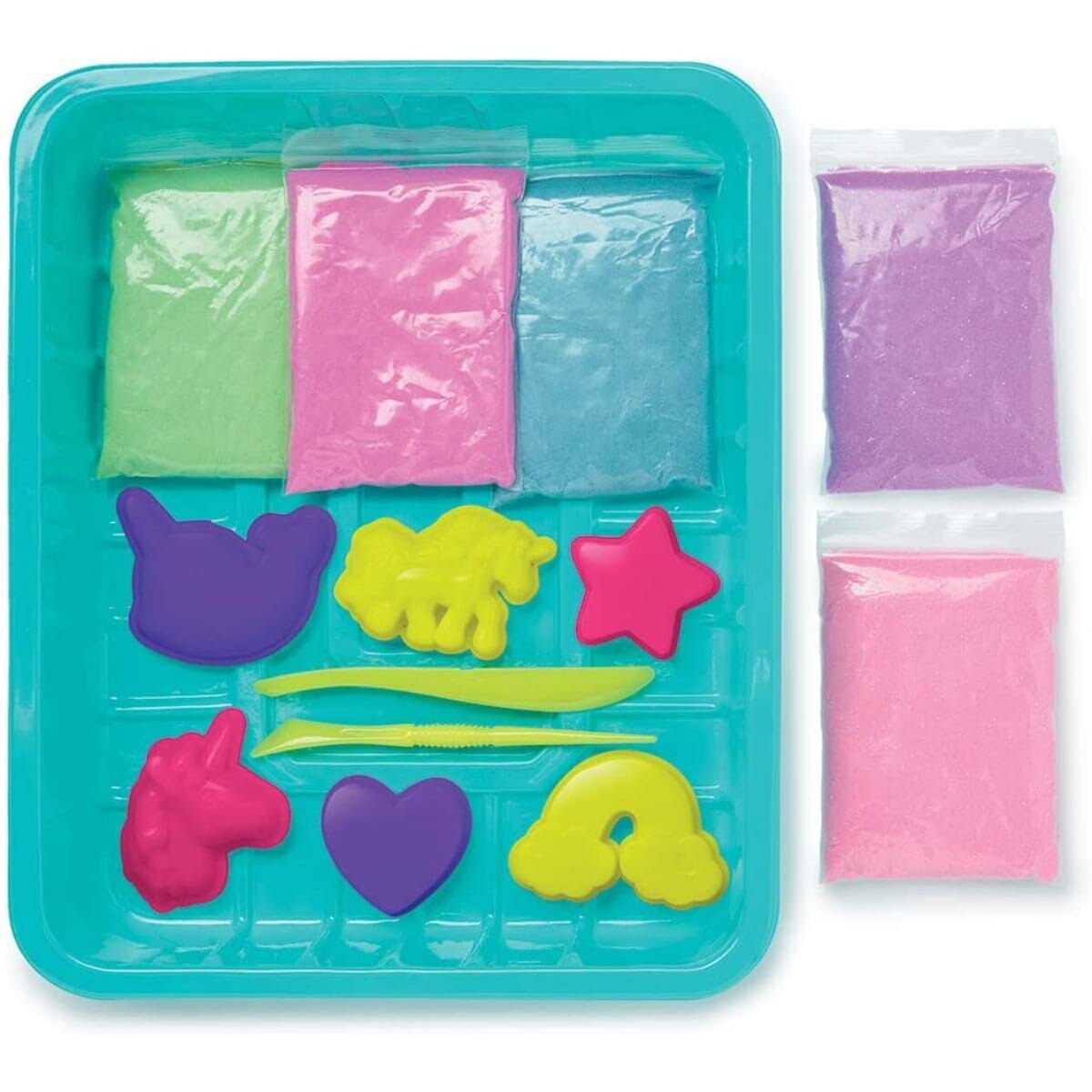 - The set comes with 1.1lbs (500 grams) of sand ( 10.6oz. 300 grams of bright sand and 7.1oz. 200 grams of sparkly glitter sand), two tools and six moulds, plus a sand tray for plenty of mess free fun.