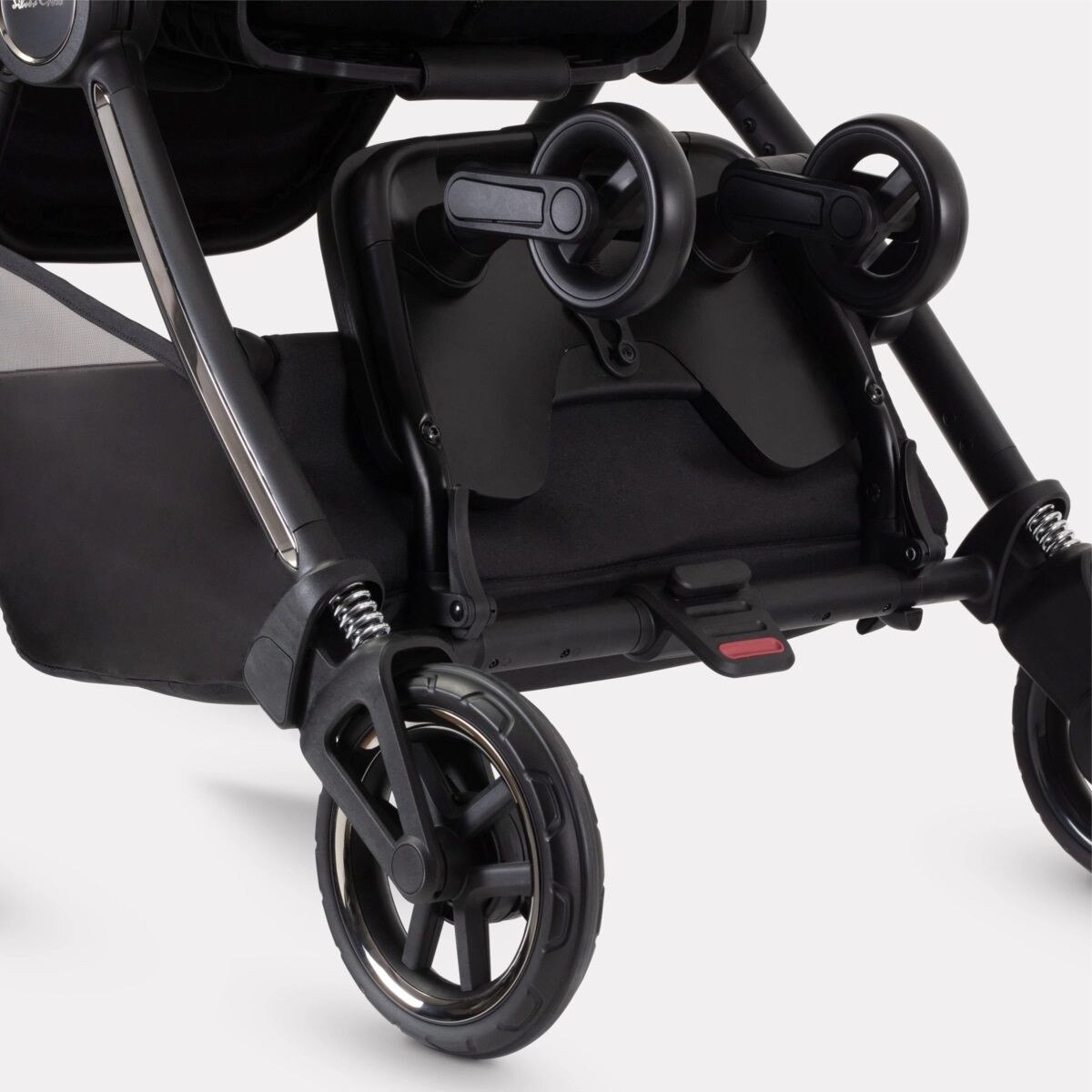 - Two swivel wheels have puncture-free tires and independent suspension for a smooth ride