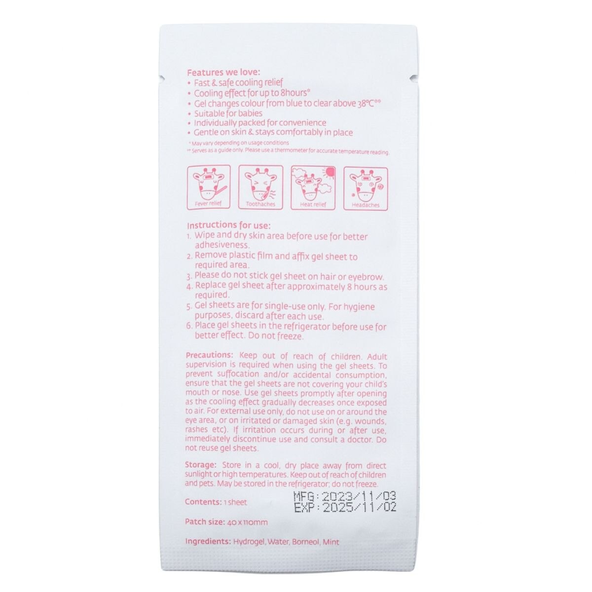 Keep our of reach of chidren. Adult supervision is required when using the gel sheets. To prevent suffocation and/or accidental consumption, ensure that the gel sheets are not covering your child's mouth or nose. Use gel sheets promptly after opening as the cooling effect gradually decreases once exposed to air. For external use only, do not use on or around the eye area, or on irritated or damaged skin (e.g. wounds, rashes etc). If irritation occurs during or after use, immediately discontinue use and consult a doctor. Do not reuse gel sheets.