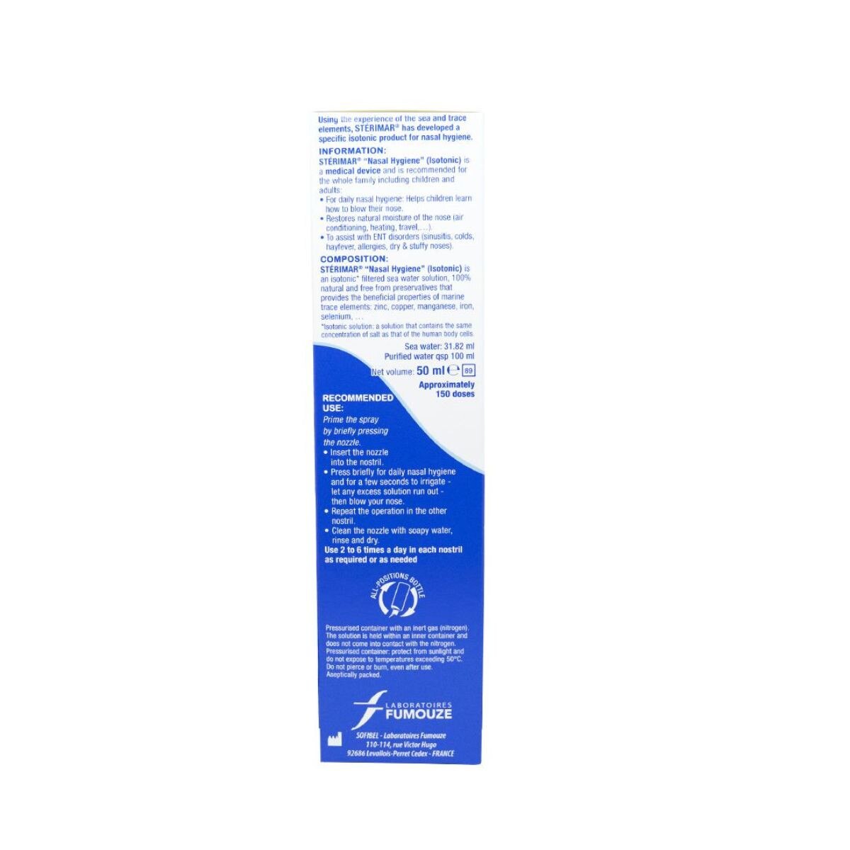 Sterimar Isotonic Nasal Hygiene Spray that is suitable for children and adults. It contains the same concentration as that of the human body cells to maintain nasal hygiene. Stérimar is a pure, gentle and natural sea water nasal spray suitable for all the family. It can be used daily to gently moisturise and clear nasal passage, to relieve dry and stuffy noses associated with hayfever, seasonal and perennial allergic rhinitis, colds, rhinitis, sinusitis and rhinopharyngitis.