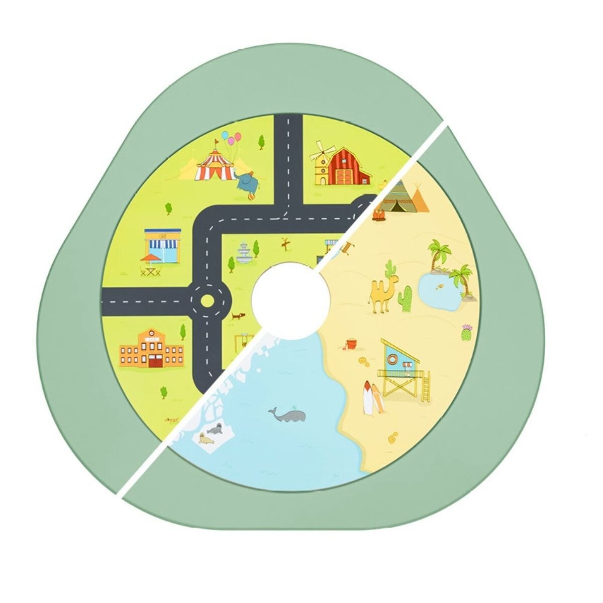 - Play table includes 3 double-sided boards for hours of activities: wooden cover & blackboard, landscape board, bricks boar