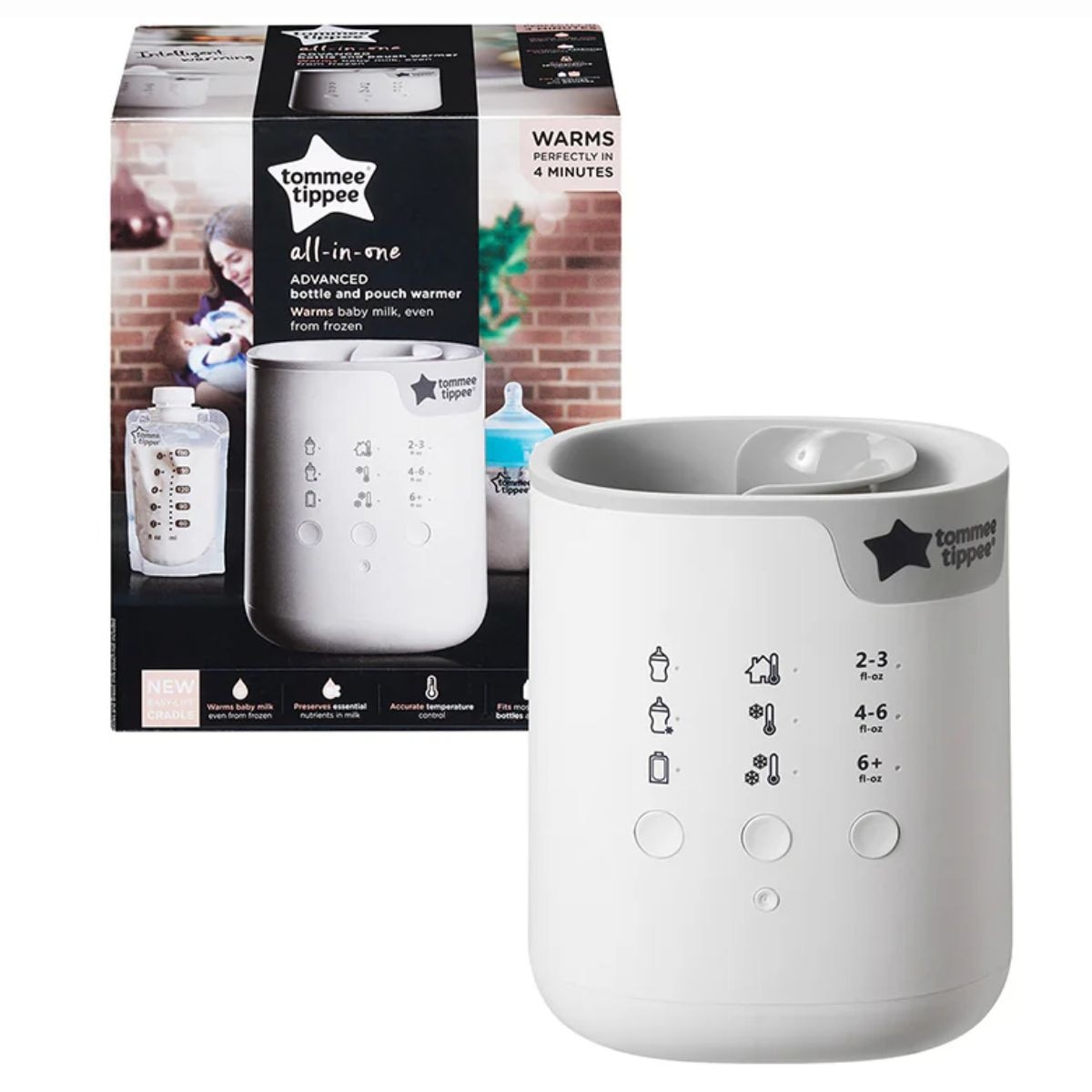 It’s not surprising that babies prefer their feeds at body temperature because that’s what feels most natural to them. The Tommee Tippee Multiwarm Intuitive Bottle Warmer allows you to warm your baby’s feed to the perfect temperature in as little as 4 minutes*. Equipped with multiple settings, you can warm various feeds based on the type of container, starting temperature and volume. Compatible with a wide range of branded baby bottles, food jars and pouches, you can warm your baby’s feeds from birth and throughout their weaning journey. The Multiwarm warmer even allows you to warm baby milk and food from frozen – just be sure to select the correct settings. Based on your selection, the warmer will automatically work out the optimum warming time. Gradual, gentle warming helps to preserve the goodness and vital nutrients in your baby’s feed and gets it to a comfortable body temperature that feels natural to baby. It also helps to prevent hot spots that could burn your baby’s mouth. Once the warm is complete, remove the bottle or food jar by lifting the cradle and avoid touching the water inside. *Warming times depend upon capacity and starting temperature of feed. Warming time of 4 minutes is based on heating a 150ml serving of milk from ambient room temperature (20°C). Box Contains 1x Multiwarm Intuitive Bottle and Pouch Warmer