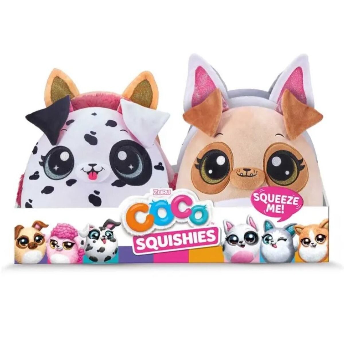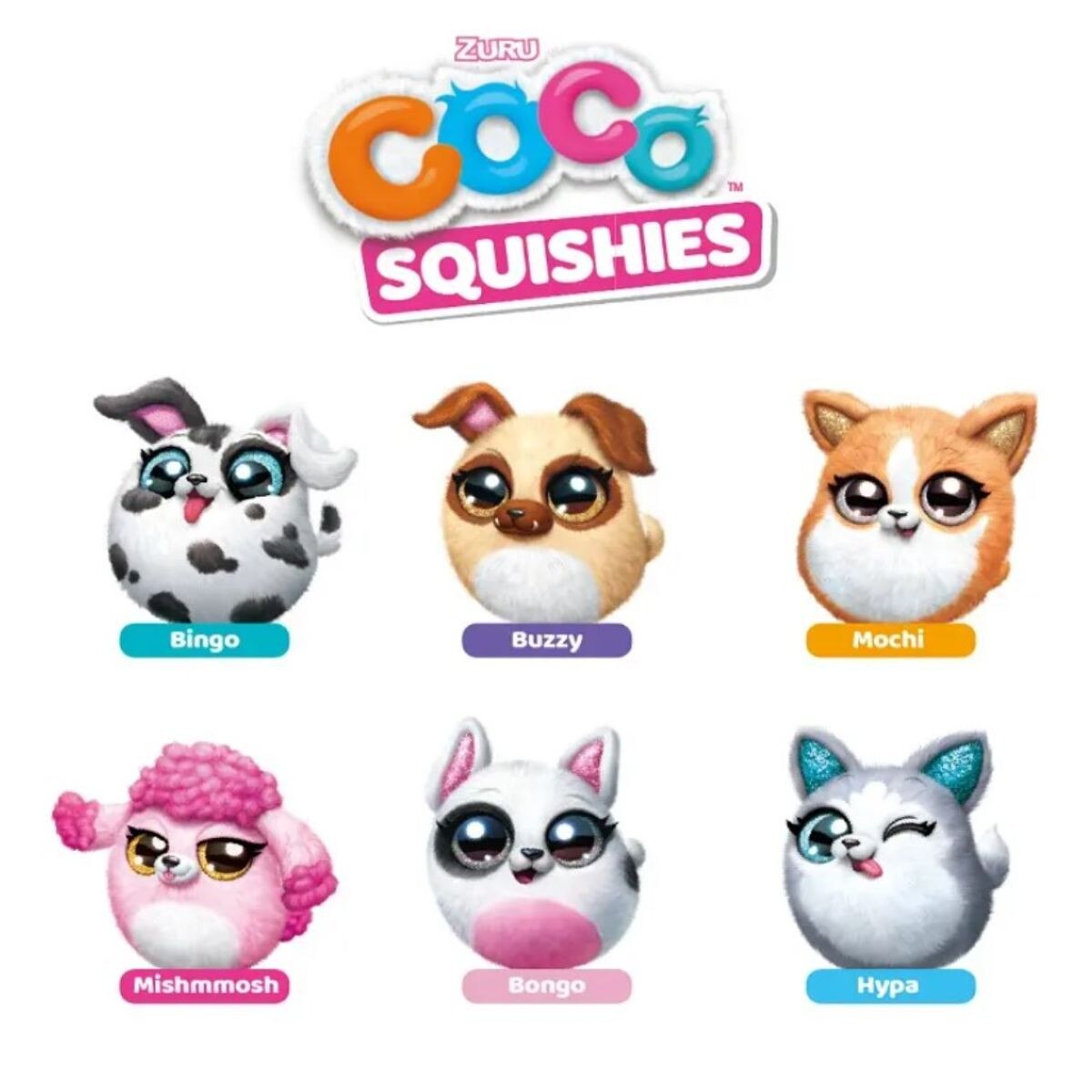 Squish, squeeze, cuddle and play with the cutest family of brand NEW Coco Squishies! There are 6 softest and cuddliest puppies to collect: Bingo the Dalmatian, Hypa the Husky, Mochi the Corgi, Mishmosh the Poodle, Buzzy the Pug and Bongo the Bull Terrier. These adorable puppies are perfect for cuddling or even using as a pillow! Every Coco Squishy has its own distinct look and a unique personality, which one will become your new BFF?