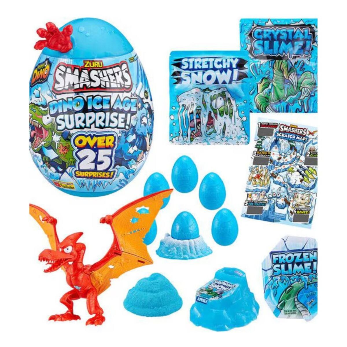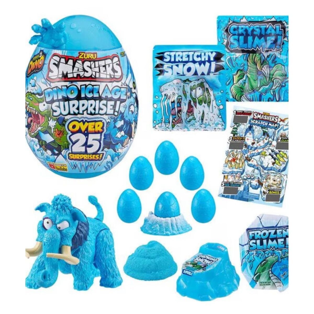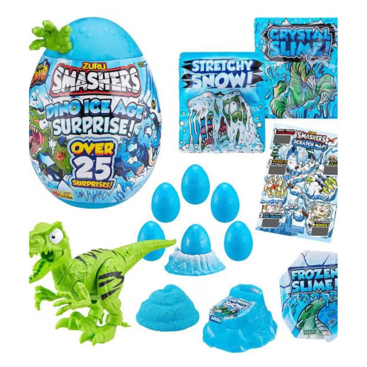 SMASHERS DINO ICE AGE SUPRISE EGG: Slime, fizz and SMASH your way through over 25 icy surprises inside to build the exclusive frozen Smash-o-saur Dino! Use the Arctic Scratch Map to excavate the Dino Ice Age to defrost compounds like the Growing Snow and Crystal Slime with hidden Smash-o-saur pieces. Collect all the pieces to start building one of 3 exclusive frozen Smash-o-saurs! Unfreeze more surprises like Smash Eggs and rebuilders. With access to Rare and Ultra Rare characters like the Blizzard Bear, the icy smashing will never end! Smash your frozen Smash Eggs on the ground, to the wall or anywhere you can think and start building your Dino Ice Age Smashers collection today!
